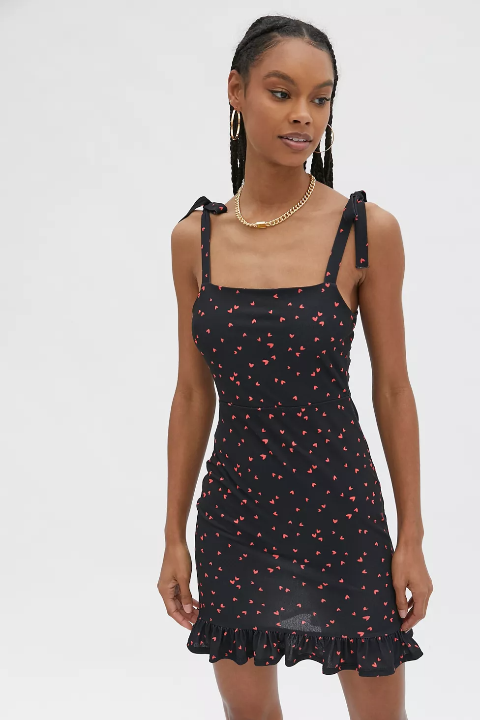 Up to 10 cash back Betty is a tie-shoulder dress with bust cups smocked panel in the back buttons down the bodice and ruffle mini skirt. This stunning mini features self-tie shoulder straps V-neckline twist detail at the bust cut out detail and a flattering A-line. Made In Usa Trina Ruffle Sequin Long Sleeve Mini.